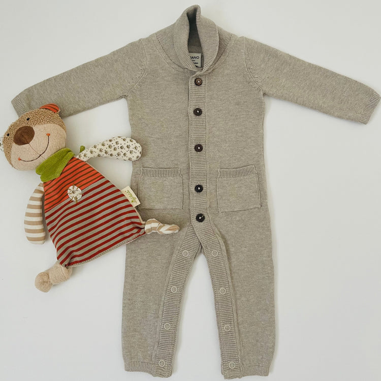 Crafted from 100% organic cotton sweater knit, this baby romper boasts a luxuriously soft, cashmere-like feel. It is designed with a timeless shawl collar, two front pockets, and coconut shell buttons to ensure both style and sustainability. For added convenience, the piece is equipped with snap closure along the crotch for fuss-free diaper changes.