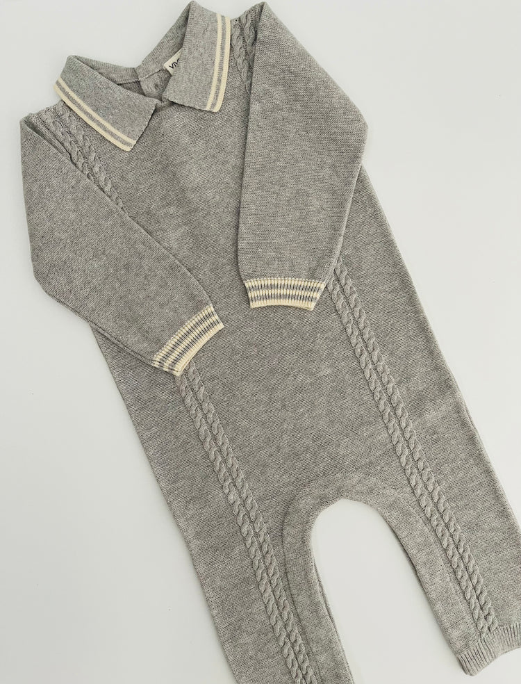 Grey classic stripe collar organic cotton baby jromper coverall with cable knit design in front.