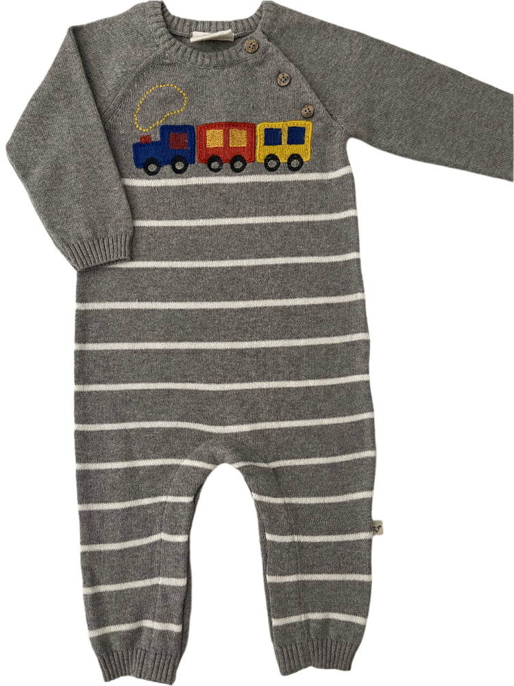 • 100% organic cotton baby sweater with train applique, embroidery & jacquard design.