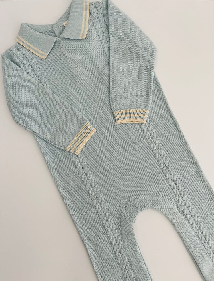 Blue classic stripe collar organic cotton baby jumpsuit coverall with cable knit design in front.