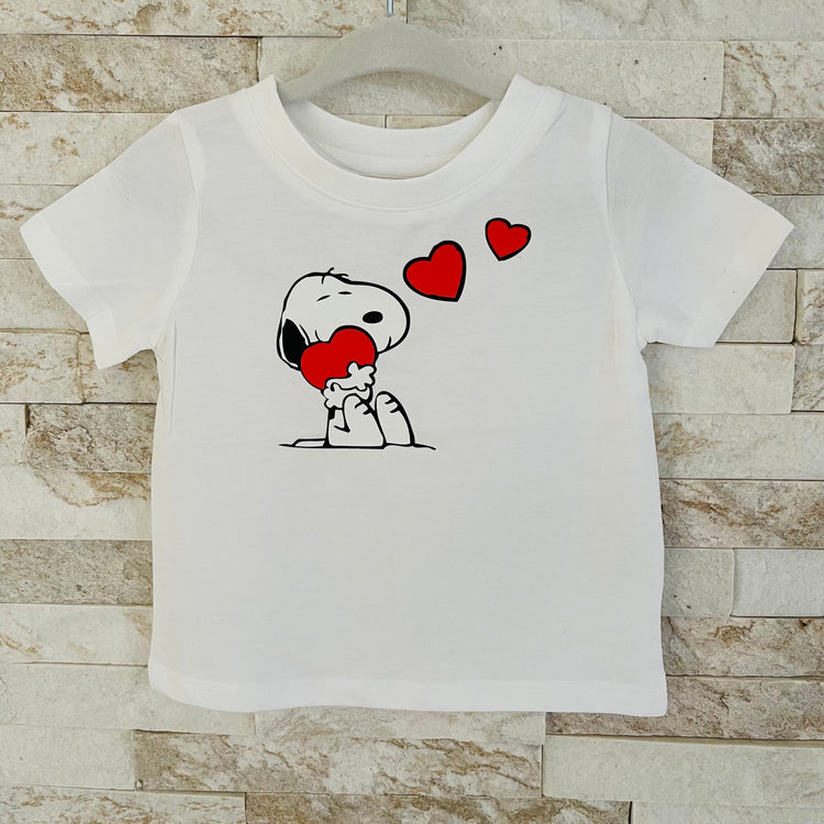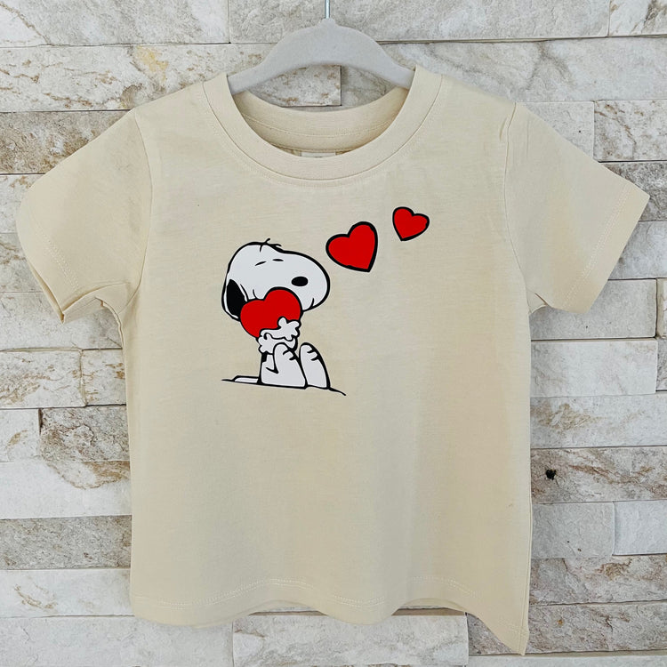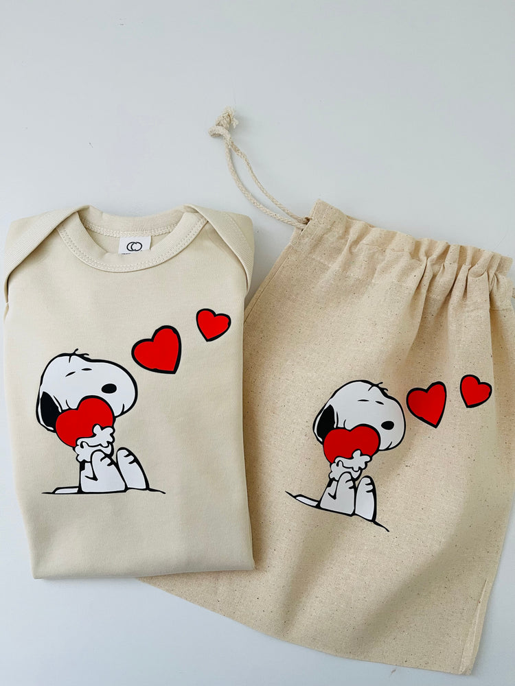 Snoopy, an old time fave showing lots of love!! Classic short sleeve crew neck T-Shirt. Each shirt comes in reusable matching pouch.