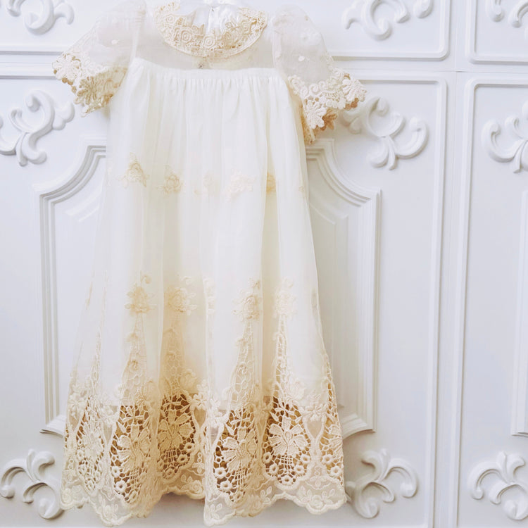 Indulge in luxury with our simply stunning dress. Exquisitely designed with embroidered tulle and lace, this dress boasts a delicate collar and sleeves. Perfect for birthdays, weddings, christenings, and other special occasions. Elevate any event with this beautiful piece.