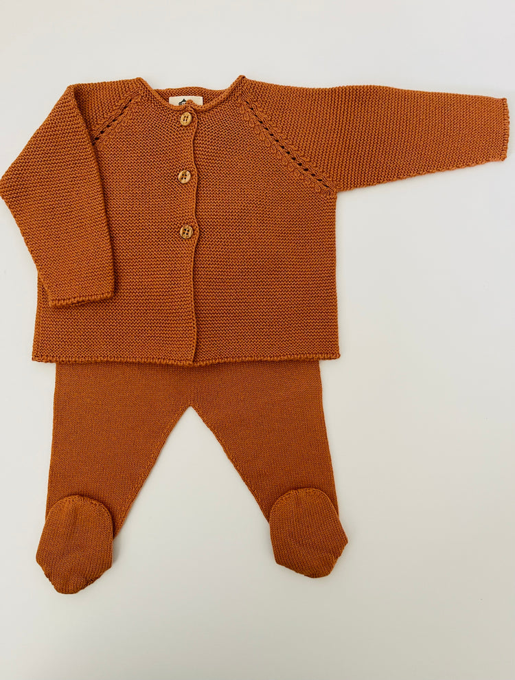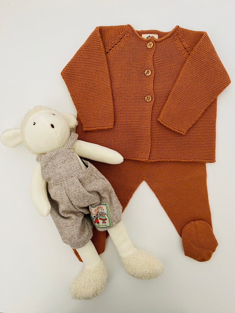 This 100% organic cotton ensemble boasts a charming brick color and features cute wooden buttons on the jacket. Additionally, it's free of any internal seams, ensuring maximum comfort for your little one without any irritation.