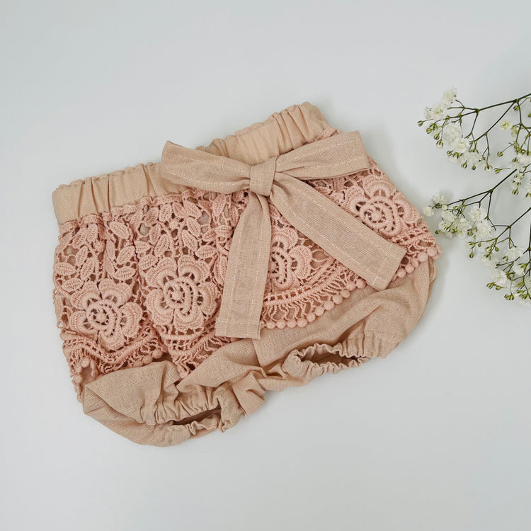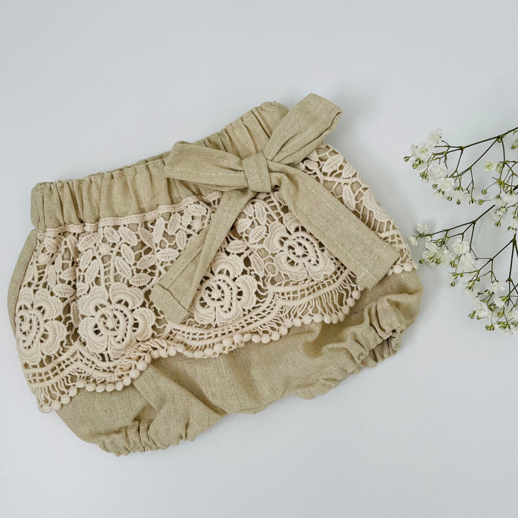 Absolutely gorgeous little baby bloomers! Natural linen and cotton lace in soft colors. Available in natural linen and blush linen. Lace detail and bow on the back, and plain linen on the front.