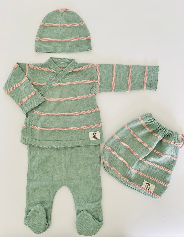 Sage Green With Pink Stripes Newborn Set in Organic Cotton