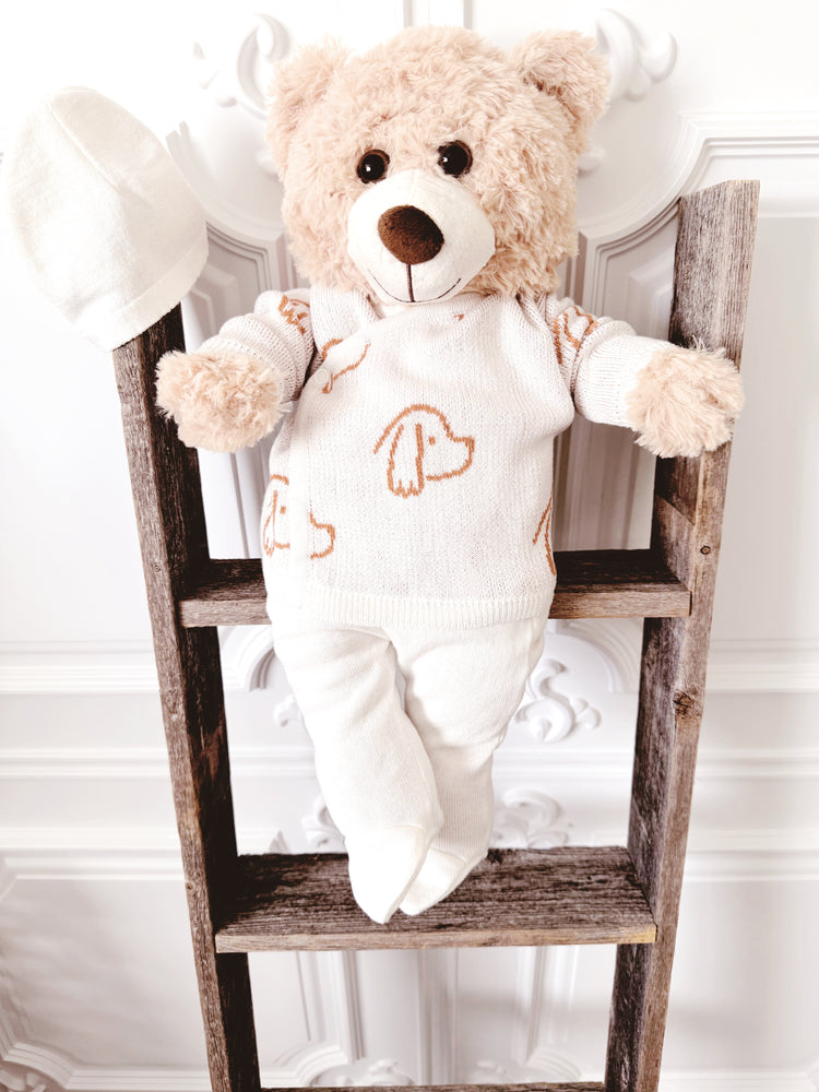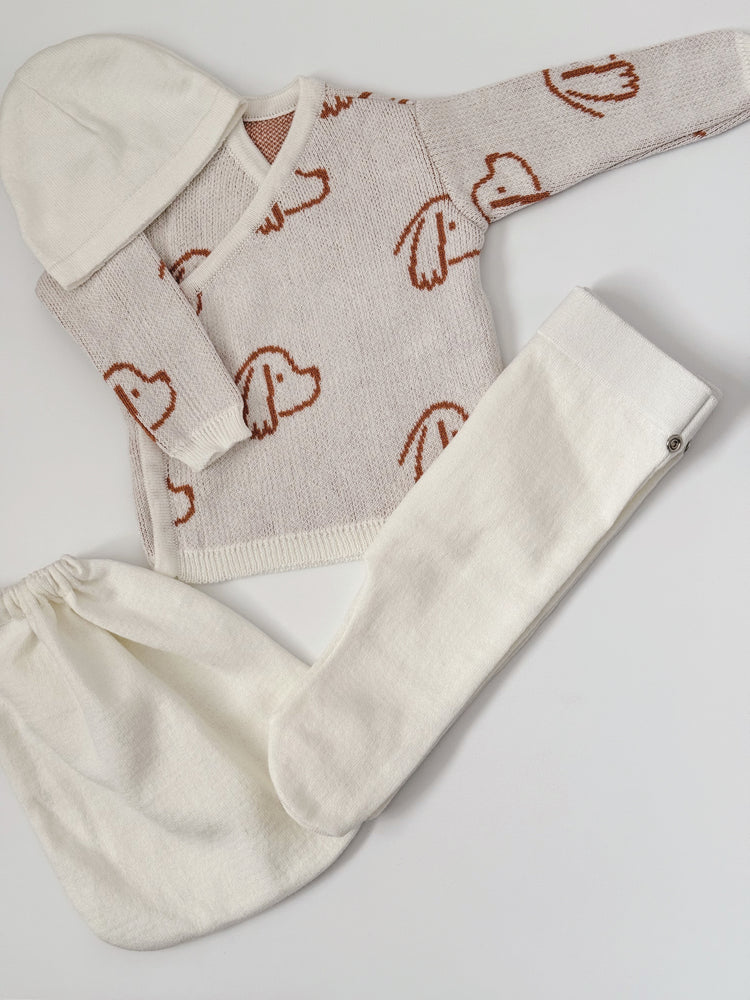 This adorable three-piece set is just irresistible! The jacket and pants connect with handy snaps, keeping everything snug so the pants stay up and the jacket stays put. Your little one stays cozy and covered all the time. Comes in a reusable pouch. Fits babies 0-3 months.